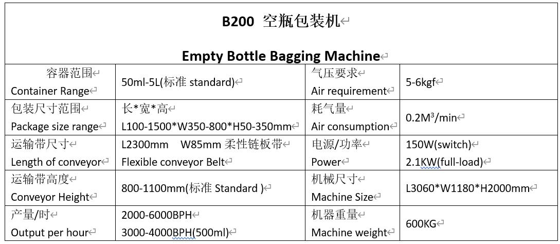 空瓶裝袋機至目前為止開發了多種型號半自動,全自動(dòng)等(děng)機(jī)型,以適(shì)用不同產量,不同瓶型(xíng)的客戶需求。標(biāo)準型適合產量2000-4000瓶/時,雙排,四(sì)排瓶適合產量(liàng)