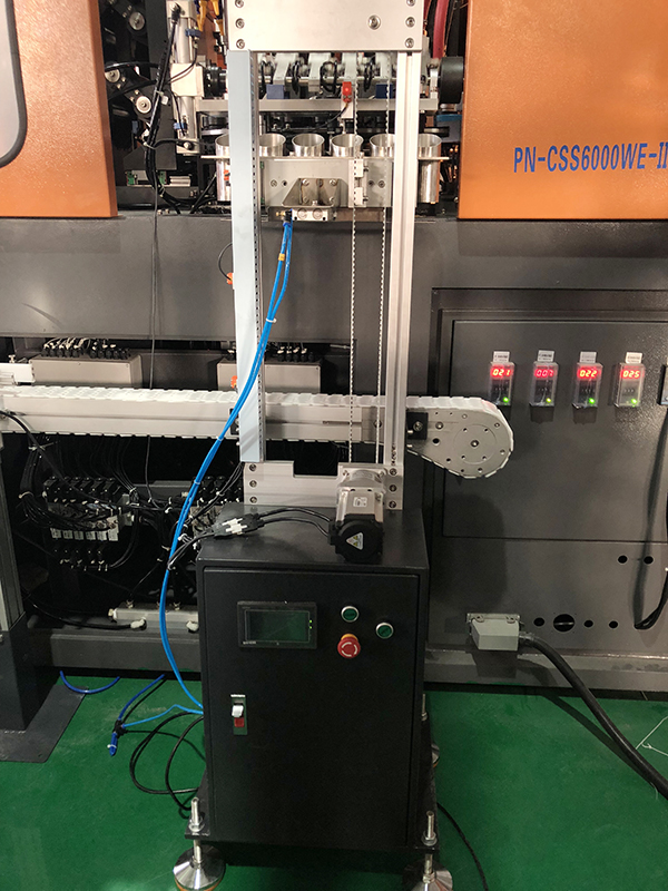 Use the manipulator to take out the bottles of the PET blow molding machine and place them on the conveyor belt. The machine is driven by a servo motor.
